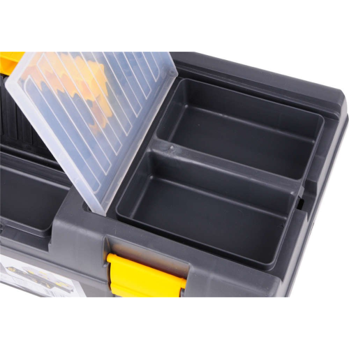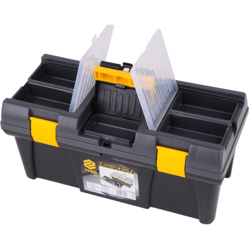 Skrzynka narzędziowa PR-20" Vorel 78813 posiada wyciąganą tackę narzędziową z miejscami do przechowywania bitów. Dzięki dodatkowym organizerom operator może przechowywać dużą ilość drobnych elementów w większym porządku. Solidne zapięcia zapobiegają przypadkowemu otwarciu się skrzyni przy transporcie. Boczne uchwyty ułatwiają przenoszenie. Skrzynka przystosowana została do przenoszenia narzędzi oraz akcesoriów wędkarskich.