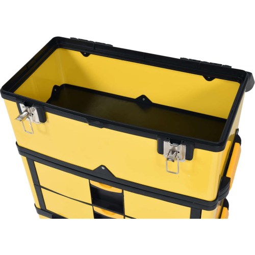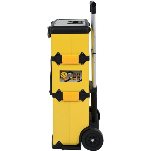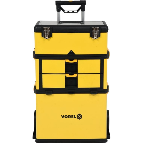Wózek narzędziowy 3-segmentowy Vorel 78738 pozwala przenosić i przechowywać narzędzia i osprzęt w wygodny i bezpieczny sposób. Wykonanie z mocnego tworzywa odpornego na uszkodzenia mechaniczne i zarysowania zwiększa bezawaryjność wózka, a także chroni przewożone elementy. Na górze znajduje się stalowy blat, na którym użytkownik może wykonać drobne prace, co poszerza zakres zastosowań wózka. Całość posiada wiele przegródek, w których operator może przechowywać drobne elementy, w celu osiągnięcia lepszej organizacji pracy. Zapięcia chronią skrzynkę przed przypadkowym otwarciem.
