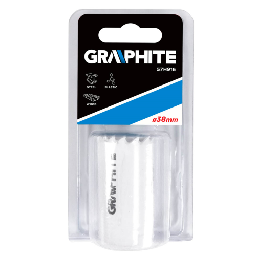 Otwornica bimetalowa GRAPHITE (nr ref. 57H916) o średnicy 38mm, dzięki progresywnemu uzębieniu, wykonanemu ze stali szybkotnącej, pozwala na wydajne wiercenie precyzyjnych otworów w stali, stali nierdzewnej, drewnie, tworzywach, kompozytach.