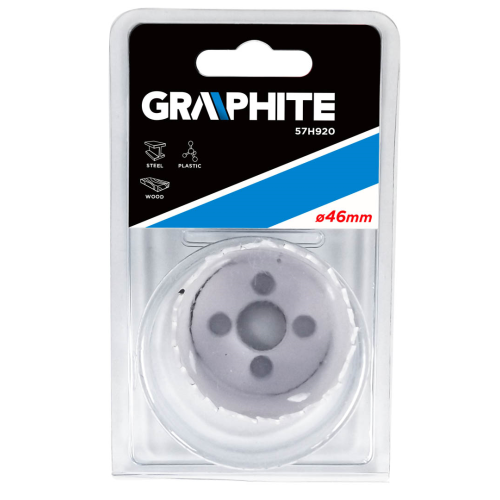 Otwornica bimetalowa GRAPHITE (nr ref. 57H920) o średnicy 46mm, dzięki progresywnemu uzębieniu, wykonanemu ze stali szybkotnącej, pozwala na wydajne wiercenie precyzyjnych otworów w stali, stali nierdzewnej, drewnie, tworzywach, kompozytach.