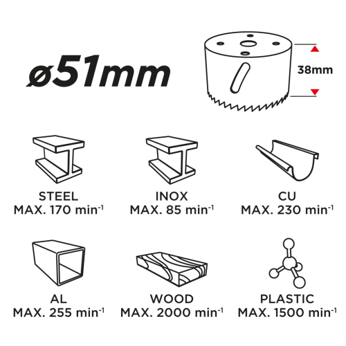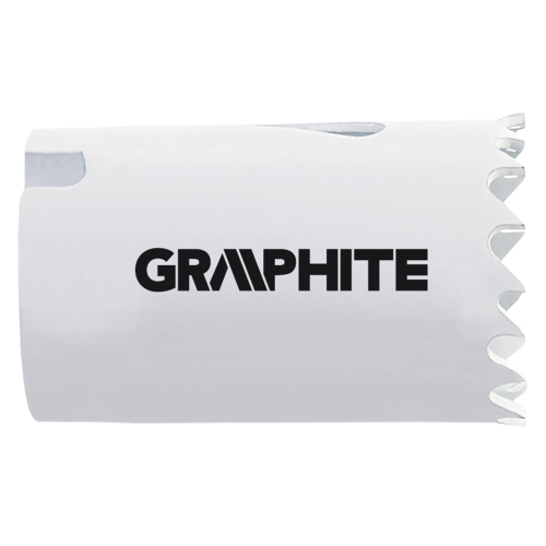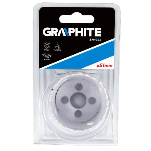 Otwornica bimetalowa GRAPHITE (nr ref. 57H922) o średnicy 51mm, dzięki progresywnemu uzębieniu, wykonanemu ze stali szybkotnącej, pozwala na wydajne wiercenie precyzyjnych otworów w stali, stali nierdzewnej, drewnie, tworzywach, kompozytach.