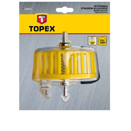 Wycinarka do otworów w glazurze TOPEX (nr ref. 16B451) wycina otwory o średnicach 40–100mm. Dodatkowym atutem jest osłona chroniąca przed rozpryskiwaniem skrawków ciętej płytki. Marka TOPEX skierowana jest do majsterkowiczów.