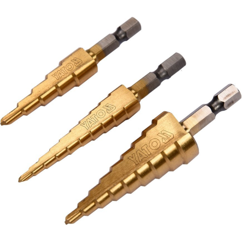 Zestaw wierteł stopniowych 3-20mm 3szt. Yato YT-44731 służą do wiercenia w stali wysokogatunkowej nierdzewnej, konstrukcyjnej i walcowanej na zimno, w metalach kolorowych, blachach stalowych oraz tworzywach sztucznych. Dzięki wykonaniu ze stali szybkotnącej i pokryciu azotkiem tytanu wiertła zapewniają wysoką wydajność pracy oraz cechują się dużą wytrzymałością. Specjalna konstrukcja sprawia, że wywiercone otwory posiadają czyste krawędzie bez zadziorów. Wiertła centrują się same zarówno na śliskich, jak i zaokrąglonych powierzchniach. Ciepło jest skutecznie odprowadzane, co zwiększa bezawaryjność wierteł i nie wpływa negatywnie na materiał. W wiertłach znajdują się 2 spiralne rowki wiórowe, za pośrednictwem których odprowadzany jest urobek.