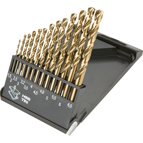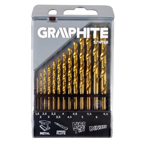 Zestaw wierteł do metalu GRAPHITE (nr ref. 57H198) o średnicach od 1.5 do 6.5mm, wykonanych ze stopu stali szybkotnącej 9341. Dodatkowe pokrycie warstwą azotku tytanu pozwala na obniżenie oporów skrawania i zachowanie wysokiej jakości wierconych otworów, szczególnie w trakcie wiercenia otworów przy pomocy automatów wiertarskich. Kąt wierzchołkowy 135° i korekta ścinu umożliwiają łatwe nawiercanie otworów bez punktowania. Idealnie nadają się do wiercenia w stali, żeliwie, elementach wykonanych z metali kolorowych (miedź, aluminium, mosiądz).