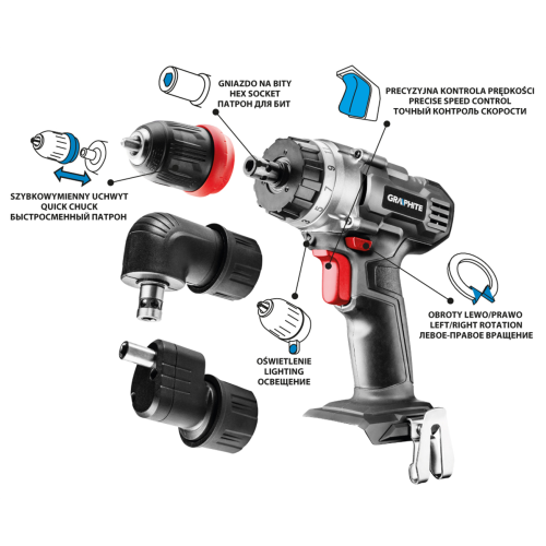 Wiertarko-wkrętarka Graphite 58G022-AD z szybkowymiennym uchwytem dla szybkiego przezbrajania. Precyzyjna kontrola prędkości i możliwość pracy z lewymi i prawymi obrotami pozwalają dostosować działanie modelu do potrzeb użytkownika. Model doskonale sprawdza się podczas prac montażowych oraz przy łączeniu i zabezpieczaniu z użyciem bitów i wkrętów. Uniwersalne gniazdo na bity pozwala korzystać z większości znanych końcówek. Wbudowane oświetlenie LED zapewnia dobrą widoczność obszaru roboczego.