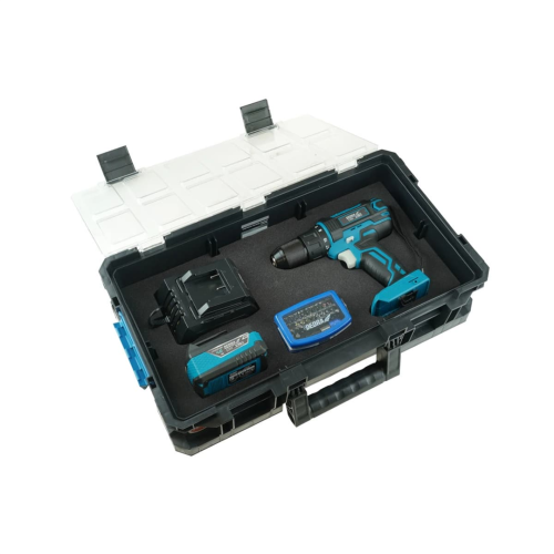 Pierwszym elementem kompletu jest wiertarko-wkrętarka wyposażona w 2 biegi, dzięki którym operator może pracować z różnymi materiałami. 19+1+1 ustawień momentu obrotowego poszerza zakres zastosowań modelu. Dzięki mocnemu mechanizmowi udarowemu użytkownik jest w stanie pracować z twardymi materiałami. Uchwyt samozaciskowy i blokada wrzeciona usprawniają wymianę elementu roboczego. Możliwość wyboru obrotów prawo/lewo sprawia, że obsługujący jest w stanie wykonać więcej zadań. Urządzenie posiada oświetlenie LED, umożliwiające pracę w ciemnościach. Zaczep na pasek sprawia, że użytkownik może nosić model zawsze przy sobie.