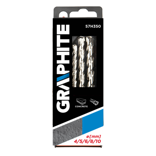 Zestaw wierteł do betonu GRAPHITE (nr ref. 57H350) o średnicach od 4.0 do 10.0 mm, posiadających końcówki widiowe o kształcie motylkowym. Pozwala to na wiercenie otworów w betonie i materiałach ceramicznych bez obawy o uślizgiwanie się wiertła na boki w pierwszej fazie wiercenia.