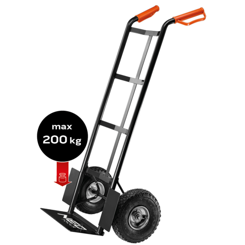 Wózek transportowy Neo 84-401 ułatwi przewożenie ładunków o maksymalnej masie 200kg. Jego spawana konstrukcja cechuje się wysoką wytrzymałością. Sprzęt wyposażono w pneumatyczne 10” koła z metalowymi felgami, które zapewniają wygodne przemieszczanie się na różnych nawierzchniach. Wózek magazynowy posiada także metalowe osłony, które chronią koła i jednocześnie zapewniają bardziej stabilną pozycję przewożonym ładunkom. Komfort obsługi wózka zwiększają ergonomiczne rękojeści z ochroną na palce, które zostały pokryte tworzywem sztucznym.
