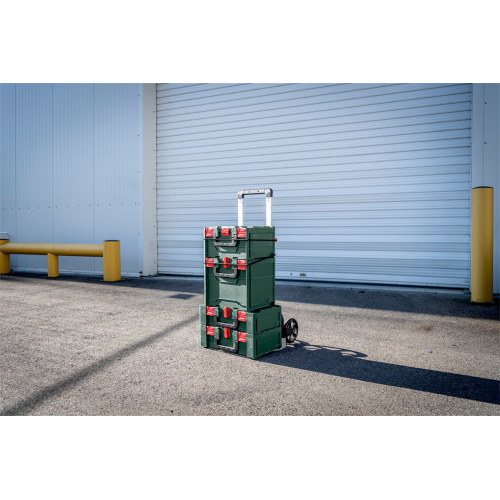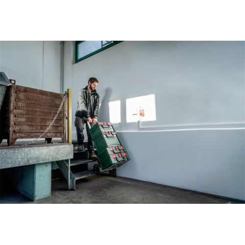 Wózek transportowy metaBOX Metabo 626893000 umożliwia przewożenie zestawu skrzyń metaBOX. Cechuje się lekką i jednocześnie stabilną konstrukcją. Można poruszać się nim po schodach. Posiada uniwersalny pas mocujący do szybkiego mocowania przewożonego towaru. Pasuje do wszystkich szerokości systemu metaBOX.