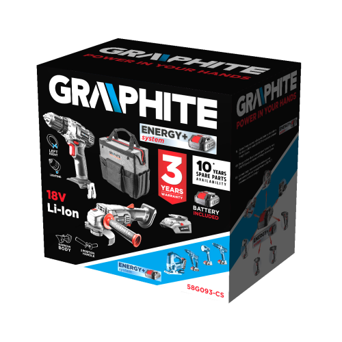 Zestaw elektronarzędzi akumulatorowych 18V 58G093-CS Graphite to atrakcyjna kompletacja, która powinna usatysfakcjonować każdego początkującego majsterkowicza. Zestaw składa się z wiertarko-wkrętarki bezudarowej 58G000, szlifierki kątowej 58G003 i adaptera USB-latarki 58G025. Dopełnieniem urządzeń jest zestaw zasilający, który reprezentują: akumulator 18V 2,0Ah, akumulator 18V 4,0Ah oraz ładowarka. Całość jest dostarczana wraz z praktyczną i pojemną torbą narzędziową, wyposażoną w koła oraz teleskopowy uchwyt. Dzięki torbie użytkownik nie będzie miał problemu z przechowywaniem i transportowaniem całej kompletacji.