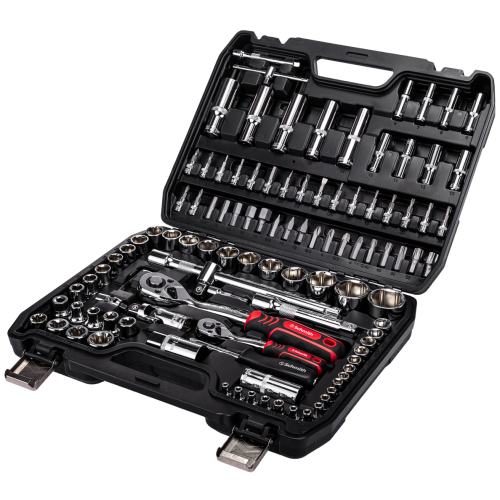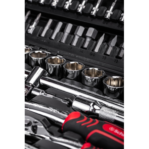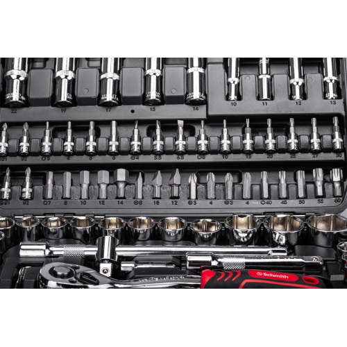 Komplet kluczy nasadowych 108 szt. Schmith SQN2-108, to idealny wybór dla majsterkowiczów i profesjonalistów. Wykonane z wytrzymałego stopu stali narzędzia gwarantują wytrzymałość i odporność na naprężenia. Wszystkie części zestawu zostały pokryte specjalistyczną powłoką ułatwiającą utrzymanie ich w czystości. Ponadto, pojedyncze elementy mają oznaczone rozmiary, co przyspiesza ich odszukiwanie. Cały zestaw zapakowany jest w kompaktową walizkę, która ułatwia przechowywanie i transport narzędzi.