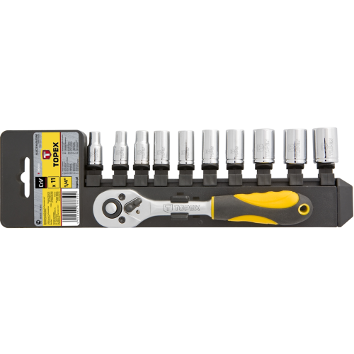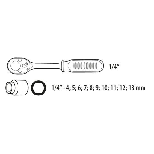 Zestaw kluczy nasadowych 1/4” ma wszechstronne zastosowanie. Idealny do drobnych prac montażowych, napraw itp. Wykonane z wysokiej jakości stali chromowo-wanadowej zapewniającej długoletnią żywotność. W zestawie znajduje grzechotka z ergonomiczną rękojeścią, pokrytą antypoślizgowym materiałem, co zapewnia wygodę i bezpieczeństwo podczas pracy oraz 10 nasadek sześciokątnych. Wszystko umieszczone na praktycznym wieszaku.