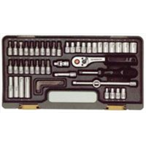 Zestaw nasadek 4-13 mm, nasadki głębokie 6-10 mm, nasadki z końcówkami wkrętaków prostych, PZ, TX i imbus, nasadki E4 do E8, przegub krzyzowy, dwie przedłużki, uchwyt śrubokręta z czworokątnym mocowaniem, 5 kluczy imbusowych giętych Nr 1,25-1,5-2,0-2,5 i 3,0 mm.