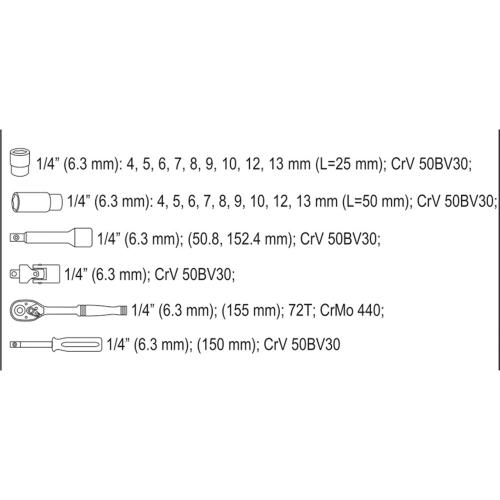• Nasadki długie 1/4": 4, 5, 6, 7, 8, 9, 10, 12, 13mm