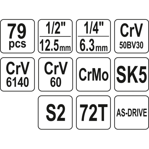 - Zarówno klucze nasadowe, jak i napęd nasadek zostały wykonane z wytrzymałej stali narzędziowej CrV