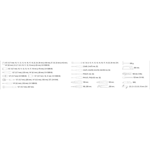 - Klucze płasko-oczkowe: 6, 7, 8, 9, 10, 11, 12, 13, 14, 16, 17, 19, 22, 24mm
