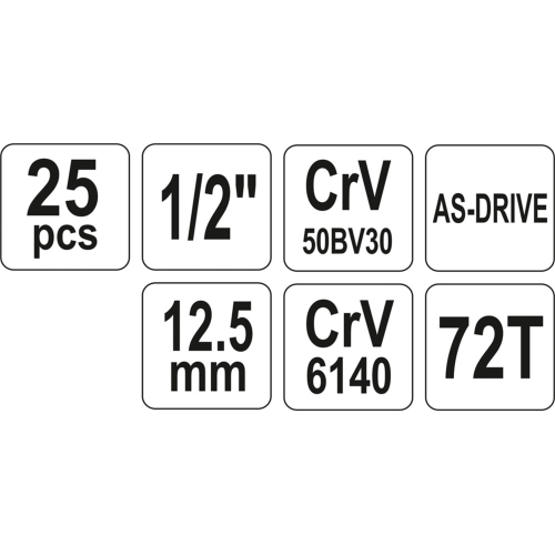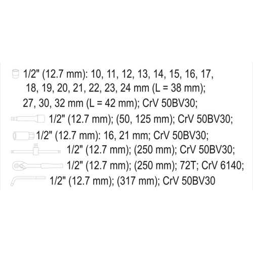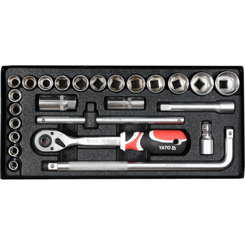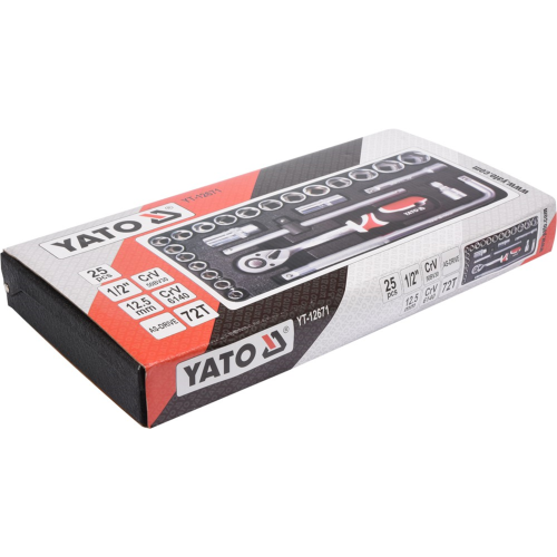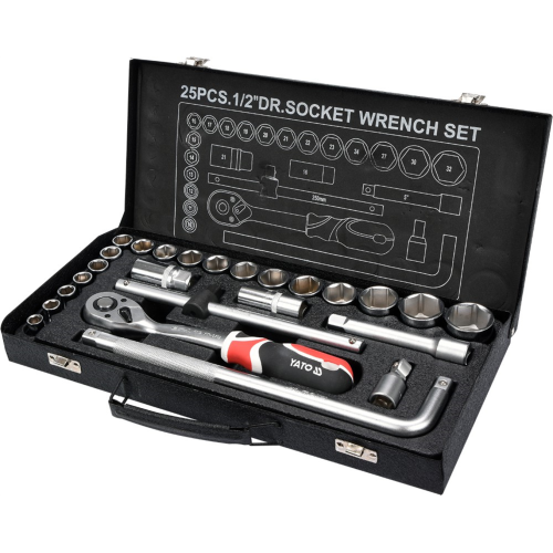 Zestaw narzędziowy 1/2" (25szt.) Yato YT-12671 to praktyczny i niezawodny zestaw kluczy nasadowych i innych akcesoriów przeznaczony do wykonywania drobnych prac montażowych i naprawczych w garażu i warsztacie.