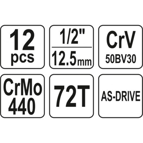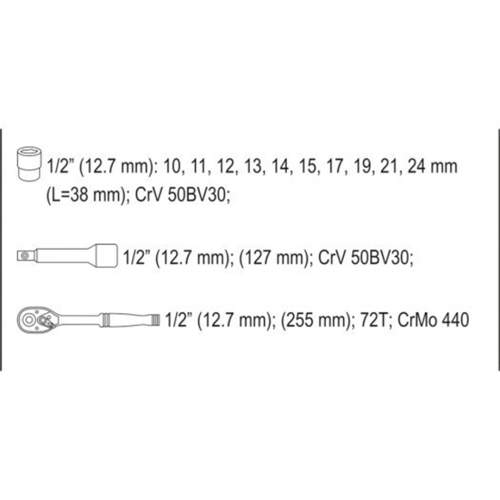 Klucze nasadowe, jak i napęd nasadek, zostały wykonane z wytrzymałej, narzędziowej stali chromowo-wanadowej CrV 50BV3.