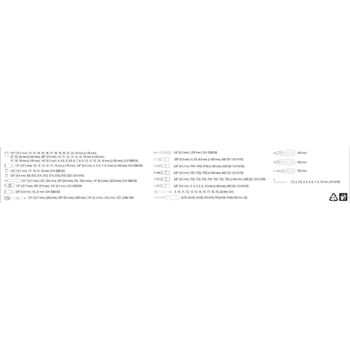 - Nasadki 1/4": 4, 4.5, 5, 5.5, 6, 7, 8, 9, 10, 11, 12, 13, 14mm
