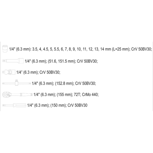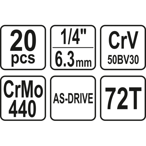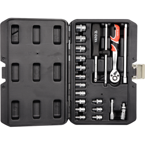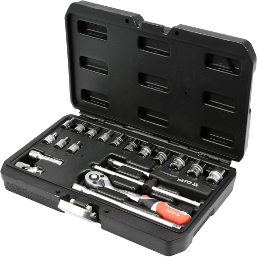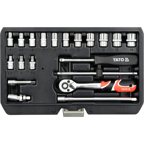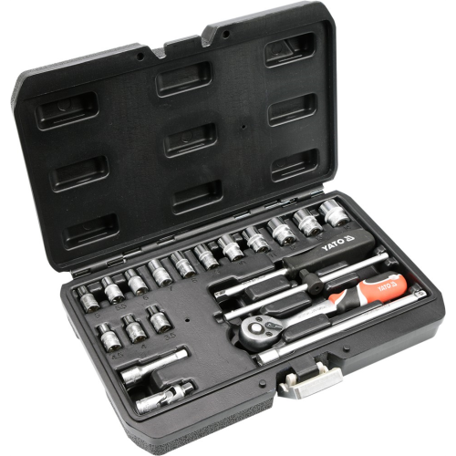 Zestaw narzędziowy 1/4" Yato YT-14491 to 20-elementowy, profesjonalny zestaw dedykowany do prac serwisowych i warsztatowych. W zestawie znajduje się bogaty wybór nasadek 1/4" w rozmiarach 3,5-14mm, 2 przedłużki 1/4", grzechotka 1/4", przegub Cardana1/4", pokrętło przesuwne 1/4" oraz pokrętło wkrętakowe 1/4". Całość uporządkowano w wygodnej walizce z mocnego tworzywa sztucznego.