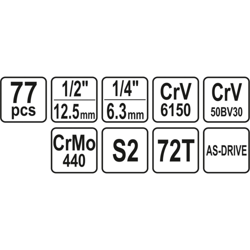 - Klucze nasadowe i nasadki wykonano z wysokogatunkowej, narzędziowej stali chromowo-wanadowej o zwiększonej odporności na odkształcenia pod wpływem obciążenia