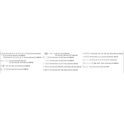 - Nasadki 1/4": 4, 5, 6, 7, 8, 9, 10, 11, 12mm