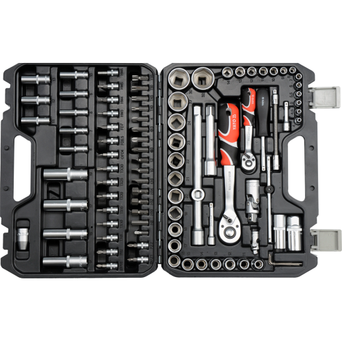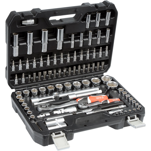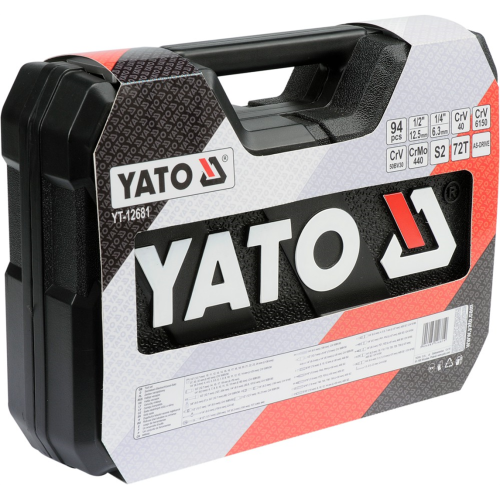 Zestaw narzędziowy (94szt.) Yato YT-12681 został tak skomponowany, aby spełniać potrzeby wyspecjalizowanych serwisów samochodowych i mechanicznych. W solidnej walizce z tworzywa sztucznego można znaleźć szereg akcesoriów, które sprawdzą się w wielu czynnościach serwisowych związanych z odkręcaniem i przykręcaniem połączeń gwintowych o różnych rozmiarach nominalnych.